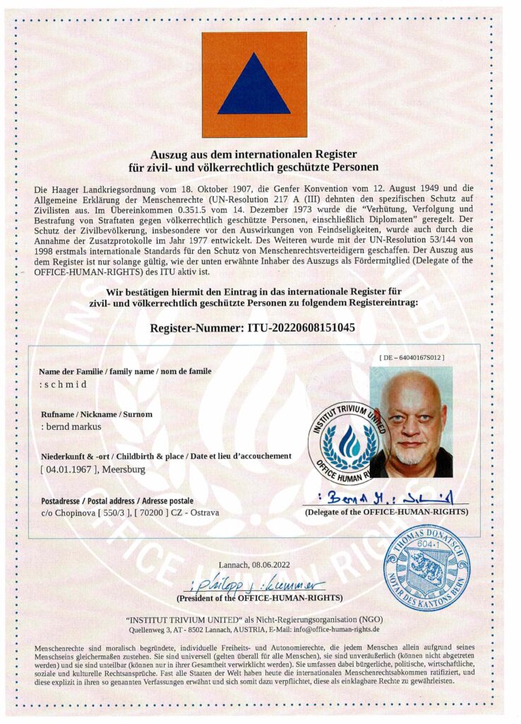 Das “INSTITUT TRIVIUM UNITED“ als NGO führt ein internationales Register für zivil- und völkerrechtlich geschützte Personen nach der Haager Landkriegsordnung, der Genfer Konvention IV und deren Zusatzprotokolle.